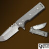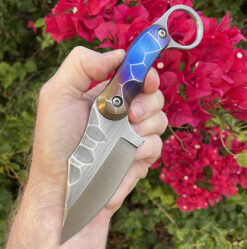 The SRambit offers a dual finish M390 blade , full tang construction with sculpted anodized Titanium overlays . Feels great in forward or reverse grip , comes with custom sheath.