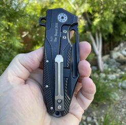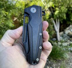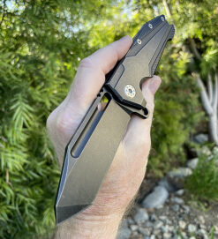 The Beast offers a Black stone washed S35VN blade on bearings , the frames are Milled and Black stone washed with satin hardware. Marked the BEAST 2015.