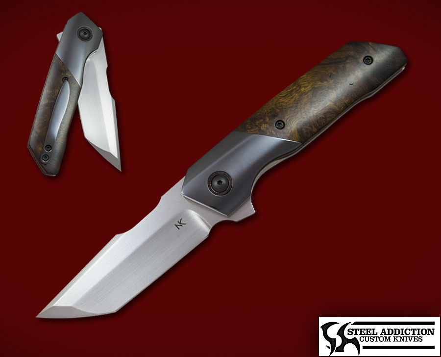 Chad really outdid himself on this HARDLINE 😉 Featuring a hand rubbed CTS-XHP blade on caged bearings , the bolsters are polished Zirconium with a detailed milled Zirconium Pivot ring. The scales are hand picked Ironwood with polished Zirconium custom clip and back spacer. The materials really flow on this piece , comes with Embroidered Makers case .