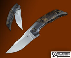 The Darkness is a excellent example of the blending of these to outstanding makers ! This One Off piece features a AEB-L blade on bearings , the scales are desert Ironwood accented by polished Zirconium bolsters with Ironwood pivot rings and a full Zirconium back spacer and clip . Chad’s fit and finish is superior , offering a buttery smooth pivot with strong flipping action and fall close . Comes with embroidered makers case 🙂