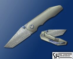 The Mini Sabot features a Huggins Damasteel blade running on bearings, the frames are contoured Titanium with anodized Titanium pivot rings and Dark Ti back spacer and clip. Exceptional fit and finish , comes with makers C.O.A. and sticker (This Piece Was Featured In Knives 2025 )