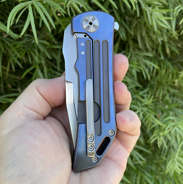 The Dominator offers a polished stone washed blade on bearings, the frames are milled anodized Titanium with Zirconium Inlays and back spacer. (Light mark on the top of the frame )