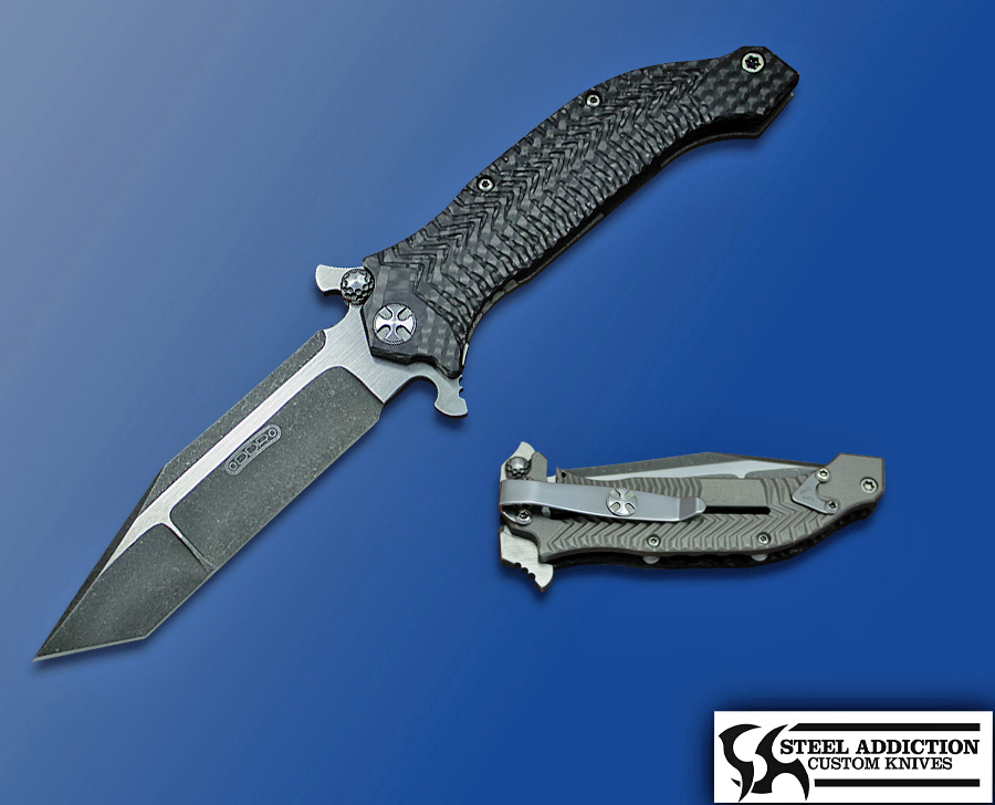 This piece features a Dual Finish S35VN blade on bearings , the frames are milled Carbon Fiber show side with a Titanium lock side . Super flipping action , has deep carry reverseable clip for tip up or down carry.