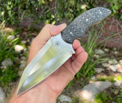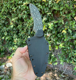 A rare piece from David featuring a satin S30V blade with hand rubbed satin flats and satin bevels in 3/16 stock , comes with custom Kydex sheath with Tec-Loc . Weighs in with sheath at 12.9 OZ.