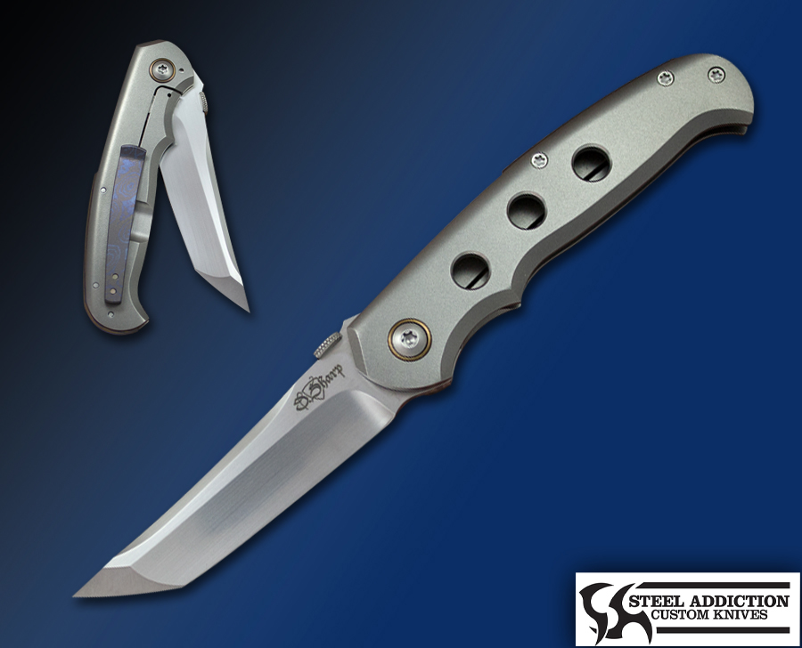 The MINI L&L ( Loveless And Lum Tribute ) offers a Multi Grind hand Rubbed IIRC XHP blade on Bronze washers , the frames are Titanium with polished and chamfered holes and Copper Pivot Rings. To top things off the sculpted back spacer and clip are heat colored Mokuti , comes with Embroidered Makers Case. David’s attention to detail and overall fit and finish on this piece is superior.