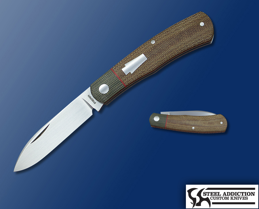 The Spear Point offers a hand rubbed CPM 154 blade , the scales are Natural Micarta with stainless shield and Green Micarta bolsters . Excellent walk and talk , with Top Tier fit and finish. Comes with custom leather slip sheath.
