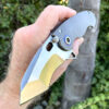 This Mula features a hand rubbed CPM 154 blade on bearings that can be opened with thumb studs or front flipper , the scales are Natural Micarta with Titanium bolsters anodized Titanium pivot rings and Mokuti clip. A perfect size for everyday carry ,offering a dead centered blade with strong flipping action. Comes with Makers Embroidered case.