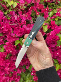 The Raptor front flipper is patterned after Enrique’s Raptor traditional slip joint profile. This piece offers a hand rubbed CPM 154 blade on bearings , the scales are Multi Layered Micarta with Contrasting bolsters and White Liners. Strong flipping action with a fall close , comes with Makers Embroidered case.