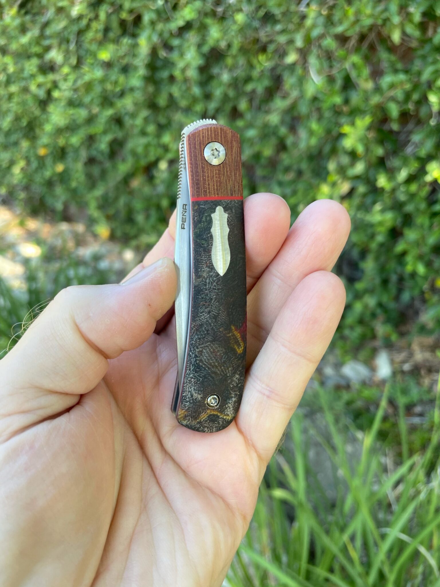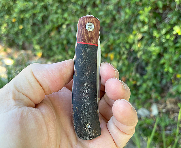 This Trapper offers a hand rubbed CPM 154 blade on bearings , the scales are Spalted Micarta with Natural Micarta bolsters Red Liners and a stainless shield. Effortless flipping action with a fall close 😉 Comes with Makers embriodered case.