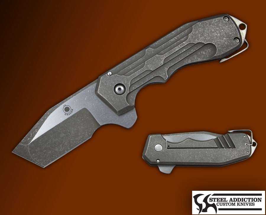 The Shorty GL features a multi grind cpm154 dual finish blade on bearings , the frames are milled and anodized Titanium with Jon’s patented Tail clip . Direct from Blade Show 2017 , sporting superior fit and finish weighs in at 5.1 OZ.