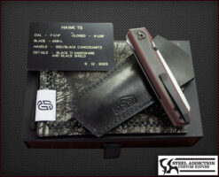 This Hawk TS features a dual deployment AEB-L blade gliding on bearings , the scales are Red & Black Camoquartz with a multi layer G10 back spacer . The overall build on this piece is superior, comes with Leather Carry sheath with Embroidered Hanky , D.O.B.card and box . Please Check Out Our Video 🙂