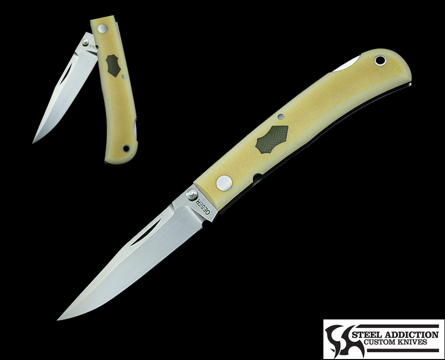 The Jess Horn OH LB (One Hand Lock Back ) is from Jared’s Heritage collection , a Tribute design to Jess Horn. This piece offers a hand rubbed CPM 154 blade , the scales are Ivory Westinghouse Micarta with Black liners, shield and Stainless liners . The overall build is superior , incredibly smooth pivot with positive lock up. Comes with Box D.O.B. card , FOX HANX and leather slip sheath.