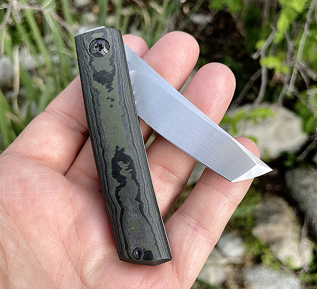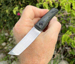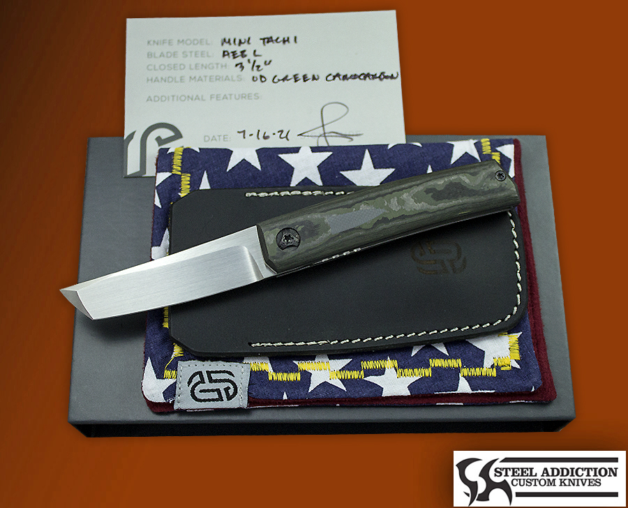 This a new model in Jared’s catalog ! This Mini Tachi features a Hand Rubbed Satin AEB-L blade , the scales are OD Green Camocarbon Fiber with stacked G10 back spacer . The overall build on this piece is superior, , comes with Leather Carry sheath and Embroidered Hanky , D.O.B. card and box 🙂