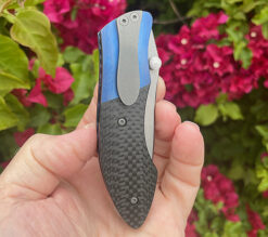 This piece features a S30V bead blasted blade running on washers , the scales are Black carbon Fiber with anodized Titanium bolsters and custom blasted Titanium clip.