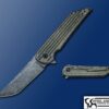 This is a Brand New model from Jim ! This Apollyon features his Persian Recurve grind in PSF 27 Stainless Steel , the frame is stone washed titanium with a seamless carbon fiber inlay . The blade is running on bearings , the hardware sports a polished domed pivot with Blue anodized screws and a Titanium deep carry pocket clip. The overall build is superior , weighs in at 5.9 OZ a perfect weight for everyday carry.