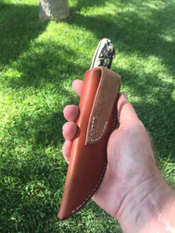 The 3/4 Chute is the perfect size for all hunting and outdoor cutting chores ! Featuring a mirror polished CPM 154 blade with tapered tang , the scales are Premium Stag with Red Liners . Top Tier fit and finish , comes with leather sheath.