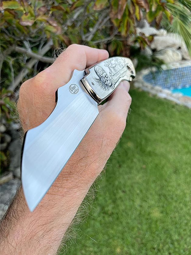 Engraved by C.J. Kai the Ti Flipper offer a hand rubbed satin blade , the frames are hand rubbed satin Titanium engraved by C.J. Kai .