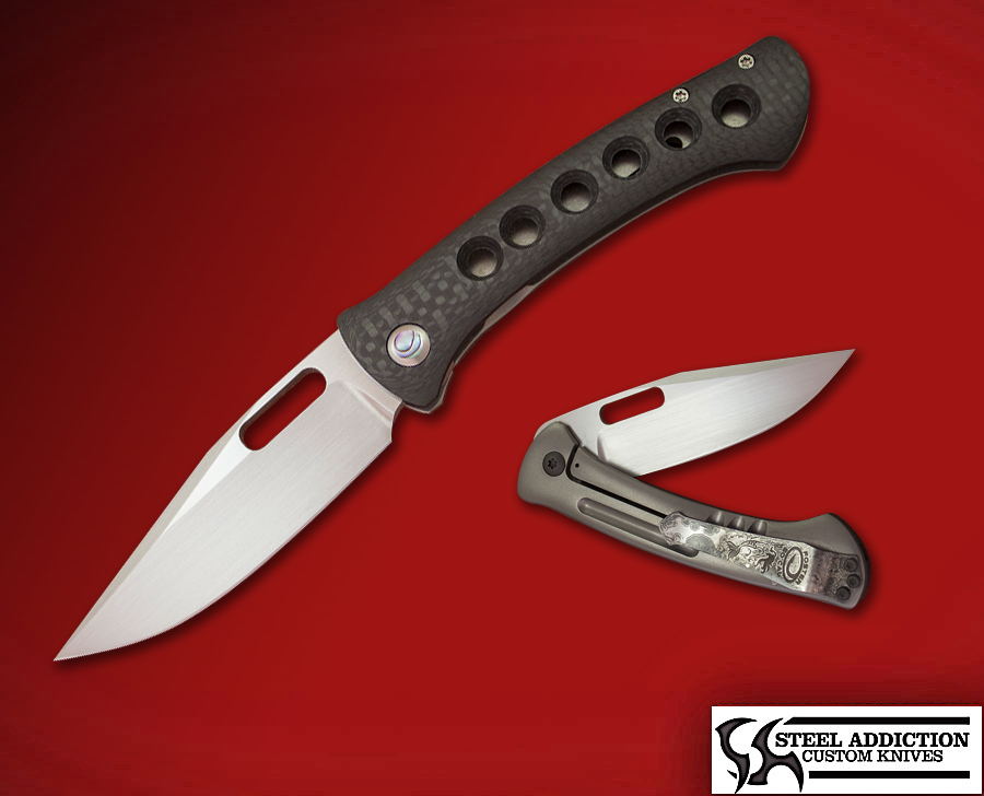 This Juvey Swordfish offers a hand rubbed CPM 154 blade running on Steve Skiff Rocket Rings Ceramic bearings , the show side scale is Carbon fiber with speed holes and a Inlaid Abalone Pivot . The lock side is Titanium with a Steel Flame Clip, comes with makers C.O.A. and Custom case by Amber. Fantastic fit and finish , a perfect size piece for everyday carry. Please Check Out Our Video 🙂