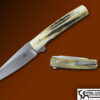 Just in from Kirby the Modified RAINE features a Chad Nichols stainless steel Damascus blade on bearings , the bolsters are Black Carboquartz with vintage Butterscotch paper Micarta scales . The accents include Heat colored Mokuti pivot rings anodized Titanium pivot and hardware , custom Zirconium clip and a Carbon Fiber back spacer. The overall build is off the charts , comes with Makers hand signed case and Kirby’s signature Guitar pick 🙂