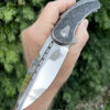 This is a rare piece from Kit featuring a polished Damasteel blade , the scales are mother of pearl with blue anodized titanium bolsters and jeweled liners . The pivot action is incredibly smooth , Kit’s fit and finish is Legendary . Weighs in at 5.8 OZ.