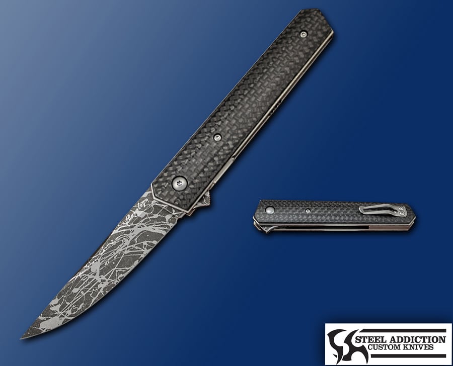 Fresh from the Burnley shop this Kwaiken has the latest Viral finish on CPM 154 steel , the scales are shrunken thick weave Carbon Fiber over a satin scratch and polish Titanium liners . The Viral blade is running on bearings , Luc’s overall fit and finish is top of the line . Comes with the Burnley triple roll display knife case and D.O.B.card . Weighs in at 3.8 OZ