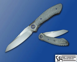 The MORPH is one of Oleksii’s most popular models ! This MORPH features a hand rubbed satin M390 blade gliding on bearings with a mirror Polished SWEDGE , the scales are Silver Twill G10 complemented by Titanium Bolsters with anodized Titanium pivot rings and hidden screw clip. The overall build is superior , buttery smooth pivot with a dead centered blade and a slow motion fall close. Comes with custom Makers case and D.O.B. card.