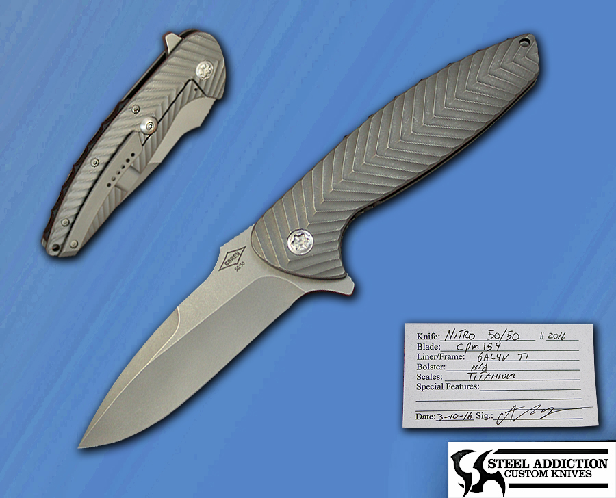 A classic from Pete’s catalog , offering a stone washed CPM 154 blade running on bearings .The frames are stone washed and milled 6AL4V Titanium with a Black G10 Dragon Spine back spacer . Superior fit and finish , comes with Makers C.O.A.