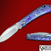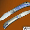 This Serpent is fully optioned ! Featuring a Multi Grind Stainless Steel Damascus blade on bearings , the double bolsters are milled Titanium with Lightning Strike carbon fiber scales. The back spacer is slotted and raised stainless Damascus with custom Damascus clip.