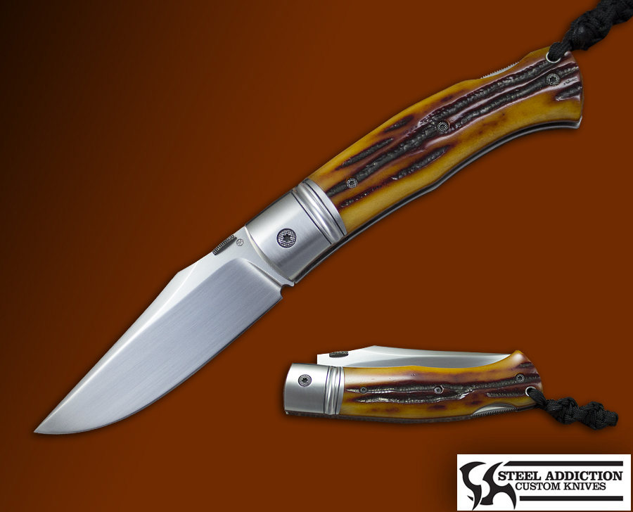 This BADASS features a hand rubbed RLW-34 blade , the scales are sculpted and polished Amber Stag with Stainless Steel liners . The bolsters are hand rubbed 416 Stainless Steel with stippled pivot screws . The fit and finish is Top of the food chain 🙂 , comes with custom sheath.