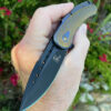 From the Blade Show run , this piece offers a Battle Black DLC coated S45VN blade on the TRI-WAY pivot system . The show side scale is OD Greenblack G10 with a Battle Black Titanium lock side .