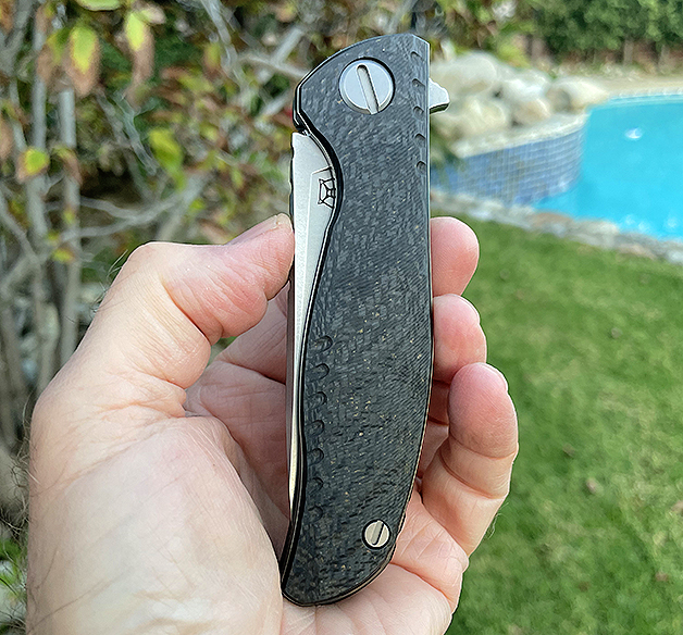 This F3 NS features a stone washed M390 blade that rides on the Shirogorov MRBS system (Multi Row Bearing System) , the scales are Bronze carbon fiber with Titanium liners. The back spacer and clip are accented with Bronze ANO . Comes With Original Box , Certificate of Authenticity and cloth.