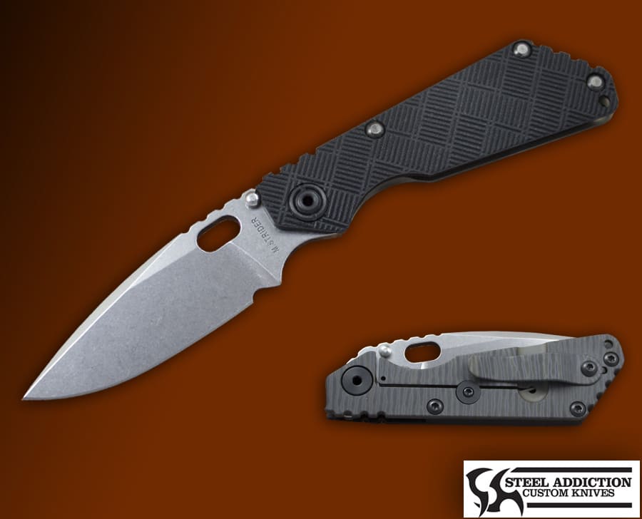 The HYBRED SNG features a CPM20CV stainless blade with the new M.Strider mark, the scales are Milled Black G10 & FlamedTitanium lock Side. Weighs in at 4.4 OZ.