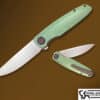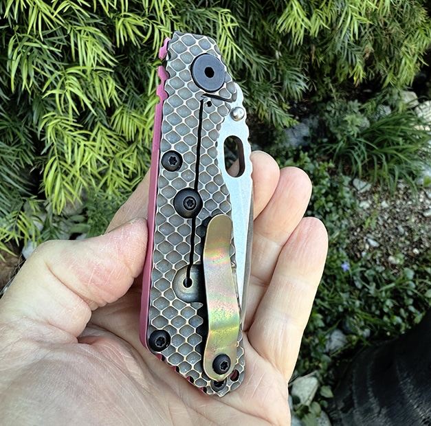 This SNG features a satin blade in S30V ridding on bronze washers , the show side scale is the Double Gunner Grip Texture in Pink G10, the lock side is Double Gunner Grip texture in Titanium with lock stop . Excellent fit and finish , razor sharp. Please Check Our Video Shot In HS 😉