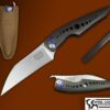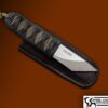This is a rare Mini Cleaver from a serialized series #013 , the handle is black nylon over Burgundy Rayskin. Comes with leather pocket sheath, weighs in with pocket sheath at 5.8 OZ.