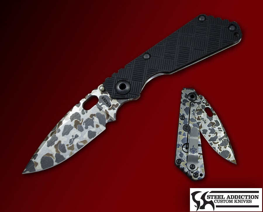 From a limited run ! This piece features the Frog Skin finish on CPM 20CV stainless steel, the scales are milled Black G10 show side with a full frog skin finish lock side. Weighs in at 4.2 OZ.