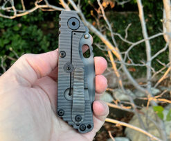 This Strider Fatty SNG features a Tiger Stripe blade in CTS-XHP , the show side scale is the Hybrid Texture in Black G10 , the lock side is flamed Titanium with lock stop . Excellent fit and finish , razor sharp.