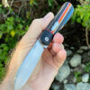 Handy Tool from Strider featuring Heat Colored Titanium with a OD Green nylon cord wrapped handle , comes with kydex sheath . Perfect for neck carry or rides great in the pocket 😉