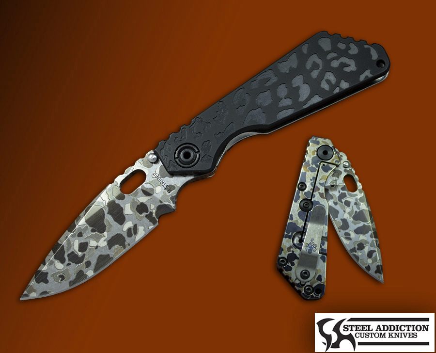 From a limited Prometheus run featuring a CPM20CV blade with a frog skin finish (MARKED M. STRIDER ) , the scales are milled and anodized Aluminum show side and a Titanium Frog Skin Lock side. The fit and finish on this piece is excellent , centered blade with a snappy detent.