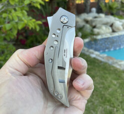 The DIE HARD is a brand new model from Tashi ! Offering a hand rubbed satin RWL 34 blade gliding on caged bearings , the frames are Titanium with Zirconium Pivot rings, speed holes and a full Zirconium back spacer. Top Tier fit and finish marked Prototype, comes with Makers Embroidered Case with satin slip sheath.