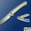 The MINI S.O.S is a new model from Tashi . This piece features a hand rubbed RLW 34 blade gliding on bearings , the frames are sculpted Titanium with Laser Etching and Mokuti Pivot rings and clip. Truly a perfect office carry with a overall length of 7 1/4 in , comes with Makers embroided case.