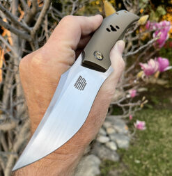 The Point Blank with M.O.A.( Minute Of Angle Holes ) features a hand rubbed satin RWL 34 blade on caged bearings , the frames and full back spacer are stone washed and anodized Bronze Titanium that has a light Orange Peel finish accented with Zirconium pivot rings. A flowing design that feels great in the hand , strong flipping action with a fall close 🙂 . Comes with satin pouch and Makers Embroidered case.