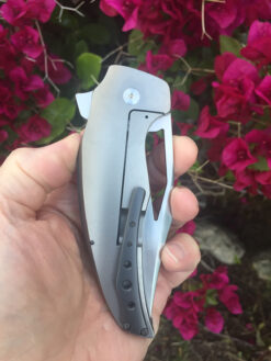 The Stardust Prototype offers a hand rubbed CPM 154 blade running on bearings , the show side scale back spacer and clip are Zirconium . The lock side is Titanium with stone washed blasted finish , she is a beast weighing at 9.2 OZ. Strong flipping action with a effortless lock release, comes with Original Dog Tag 🙂