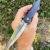 The AXYOME is a brand new model from Thierry ! This piece features a hand rubbed CPM 154 CM blade running on bearings , the scales are Black micarta with Burlap micarta inlays . Fantastic fit and finish , comes with Makers embroidered case .