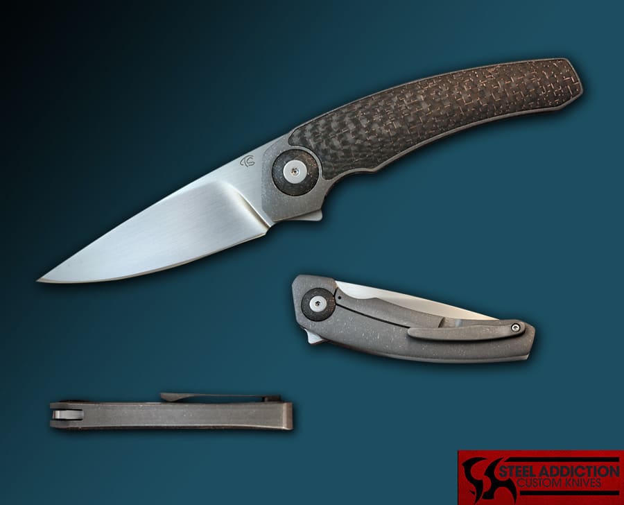 The Tomy Integral flipper features a seamless Lightning Strike Carbon Fiber Inlay and pivot ring , the blade is hand rubbed RWL-34 with a bearing system in the pivot. The overall fit and finish is fantastic. Clipped for tip up carry , weighs in at 4.3 OZ. Comes with makers case.