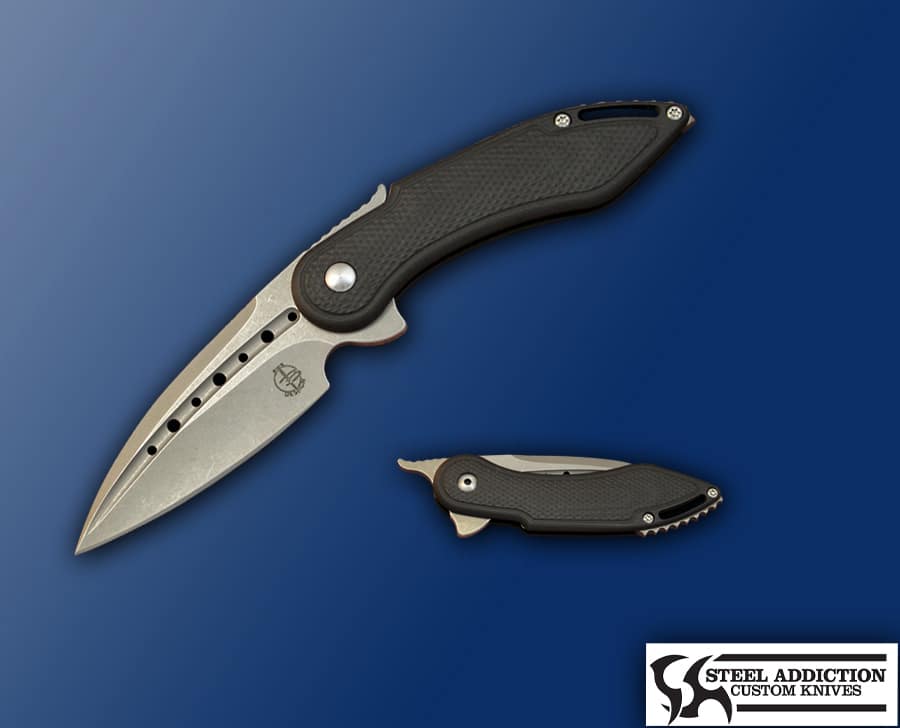 Bohler N690 blade steel, titanium back spacer and diamond checkerd g10 scales. Also features the new production logo. The friction folder is based on Todd’s wildly popular mini glimpse model. The flipper feature was retained to act as a secondary security for a more secure grip.