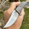 This Sebbie has had the treatment from Tom Mayo ! Featuring a new blade profile with a stone washed finish, the frames are heat colored and have been given a unique hole pattern. The pivot is as smooth as glass , weighs in at 4.5 OZ.
