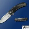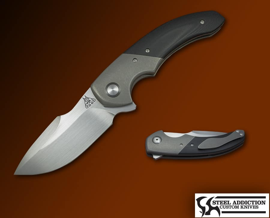 This Deimos is sporting a hand rubbed multi grind S35VN blade on bearings , the scales are black G10 with stone washed bolsters clip and Zirconium pivot ring. The fit and finish on this piece is superior . Weighs in at 7.2 OZ.